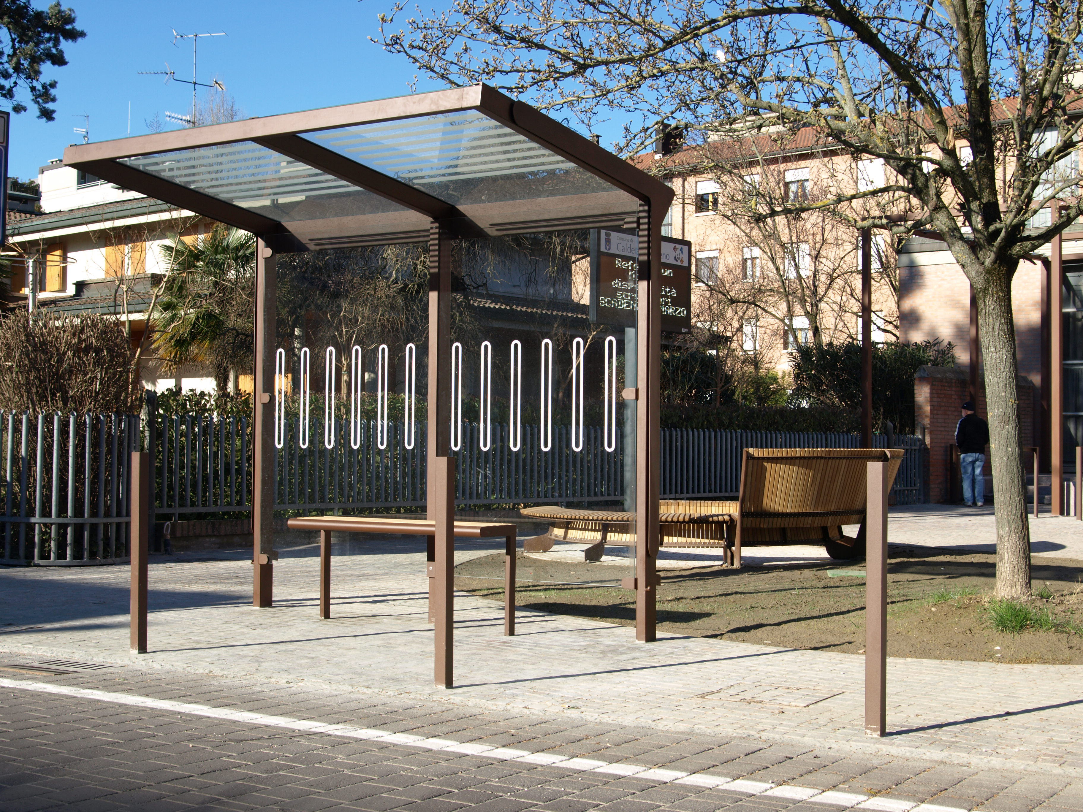 Struttura in acciaio zincato trattata con verniciatura a polvere. Pareti posteriori e laterali in vetro temprato o lamelle in legno. Tetto in vetro temprato, doghe in legno o policarbonato doppio o in acciaio perforato. Sistema di drenaggio integrato nella colonna. Uno o due CLV nelle pareti laterali. La panchina è in legno massiccio. Facoltativamente, porta-orario.
